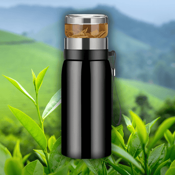 Thermos inox premium — infuseur séparé, infusion parfaite en un geste, conserve le thé chaud ou froid 12–24 h. Portable, étanche, prêt pour vos déplacements.